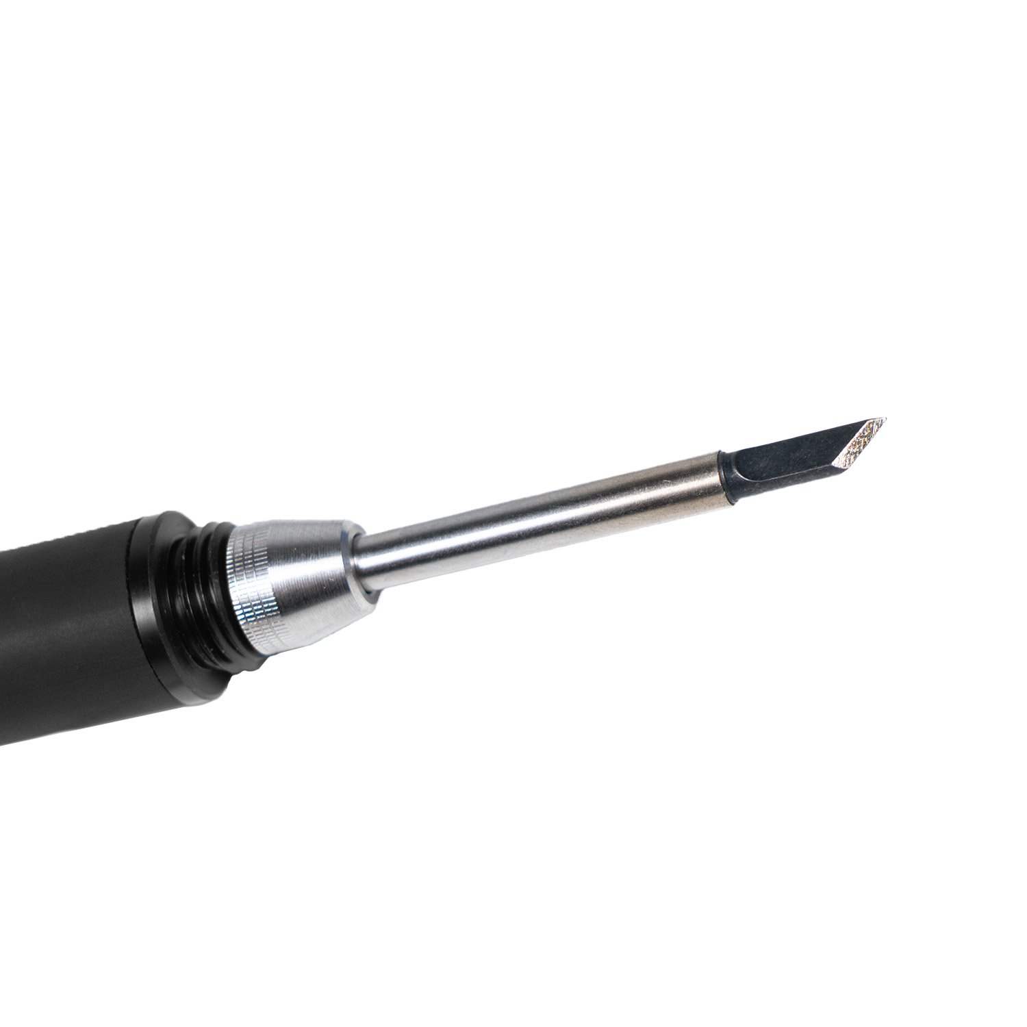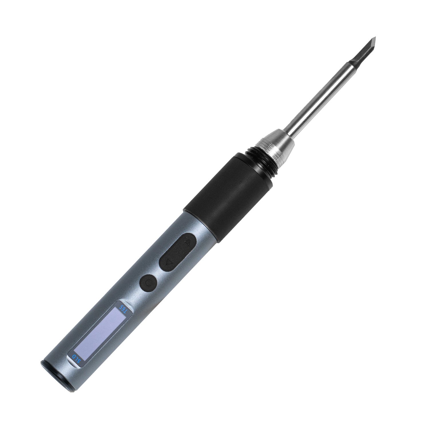 The shaft of the soldering iron reaches very high temperatures when in use, be careful to only touch the rubber grip and handle to avoid any injuries.